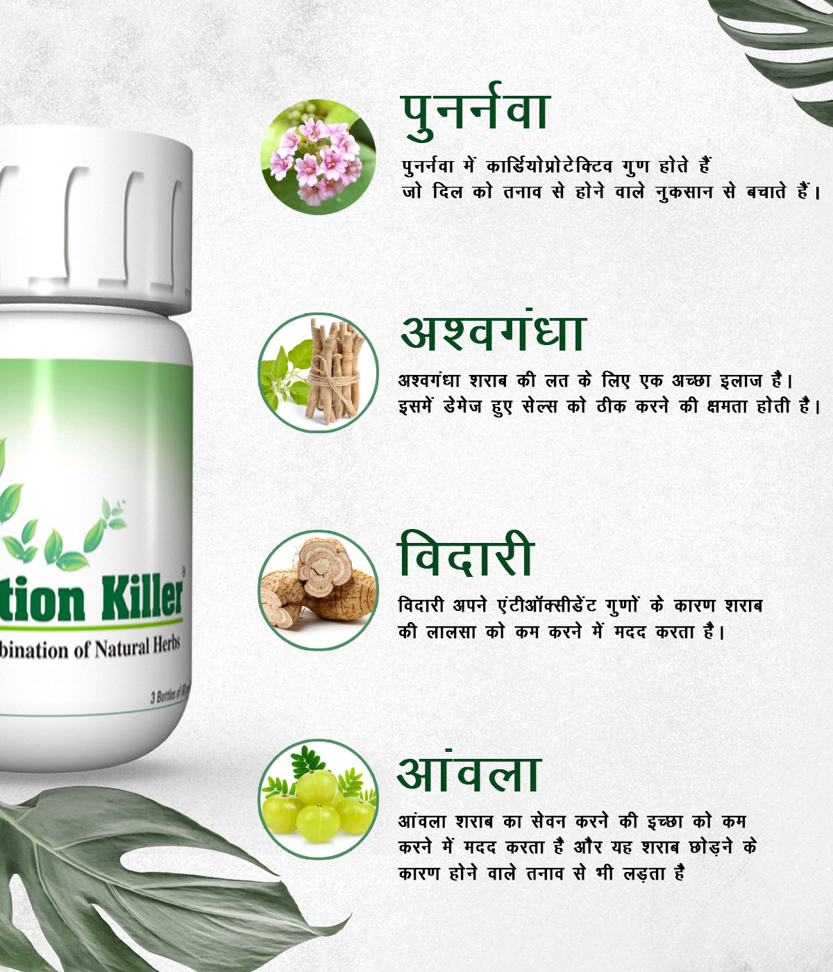 एडिक्शन किलर एक आयुर्वेदिक उपचार है जो स्वाभाविक रूप से लत के कारणों का मुकाबला करता है और लोगों को उनकी लत की कैद से मुक्त करता है।